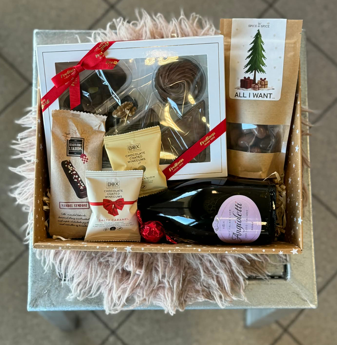 En lækker gavekurv fyldt med udvalgte godter til forkælelse. Perfekt som værtindegave, fødselsdag, tak-for-hjælpen eller bare fordi nogen fortjener lidt ekstra.
