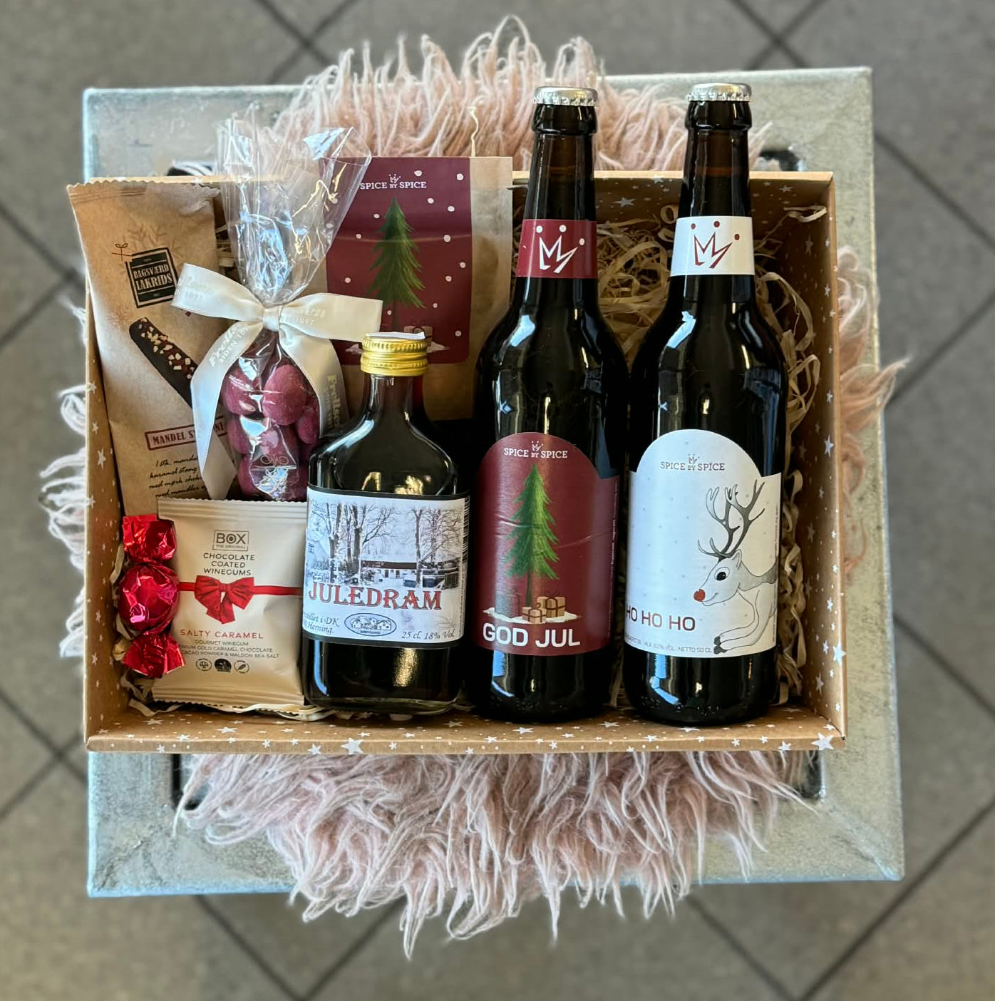 Indholdet varierer efter sæson og sortiment – vi sammensætter altid en flot kurv med lækre specialiteter for ca. 500 kr.