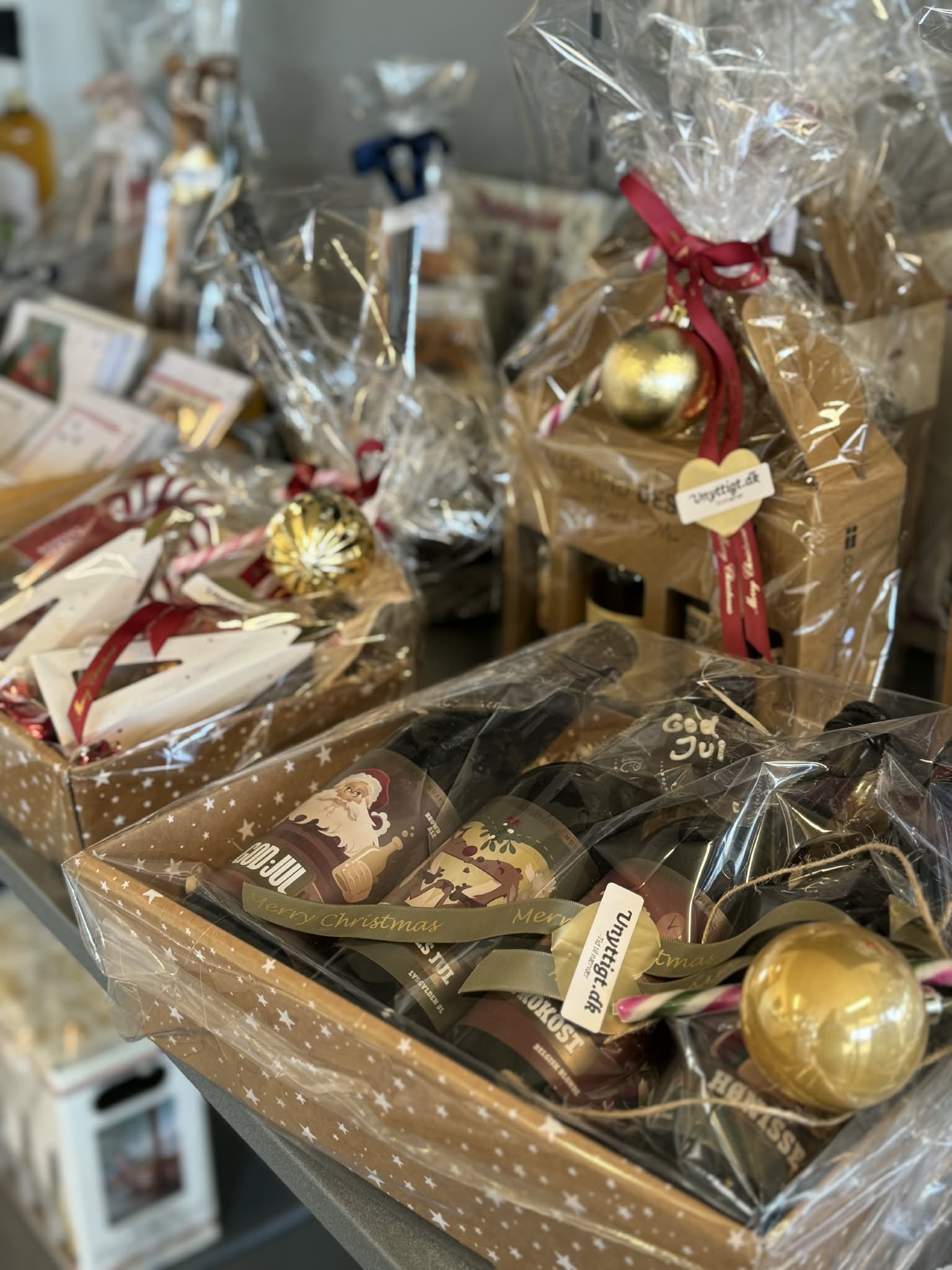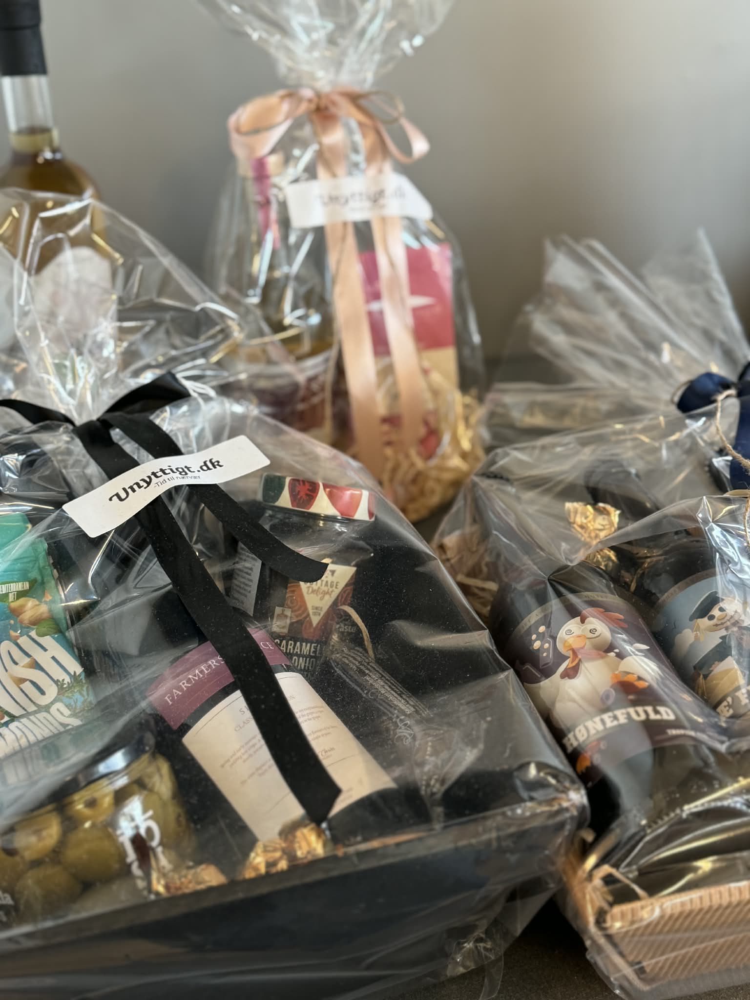Indholdet varierer efter sæson og sortiment – vi sammensætter altid en flot kurv med lækre specialiteter for ca. 600 kr.